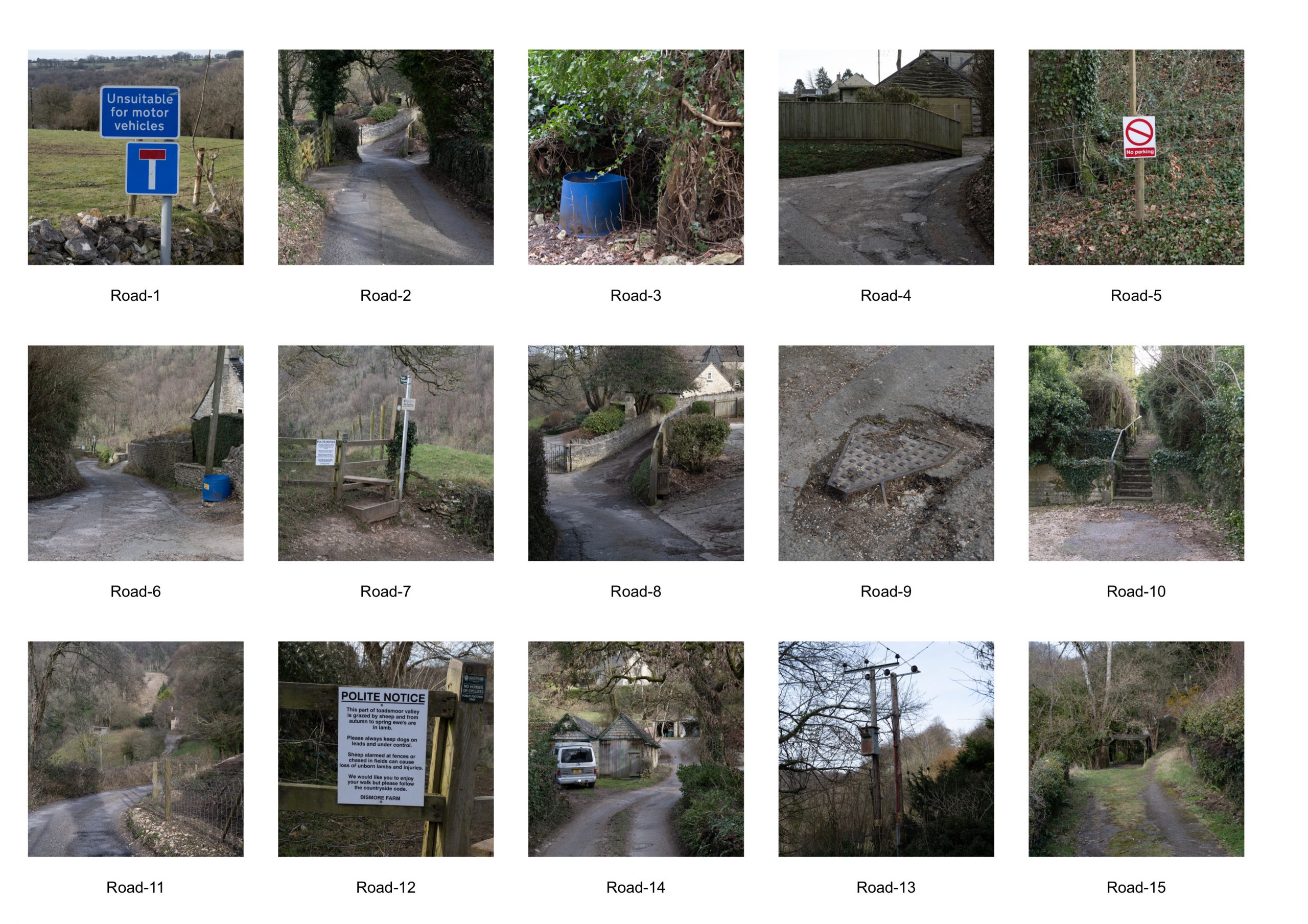 I found this exercise interesting, as the contact sheet shows, I took a variety of shots but roughly half were shot looking along the road itself and half picking out points of interest along the road. On the contact sheet I have alternated which I hope conveys some sense of travelling along the road and looking at details along the way. The road in question is the road that leads to my house and as the first image shows, it is classed as unsuitable for motor vehicles which is not fantastic for COVID deliveries. In fact, the road is perfectly suitable and we who live along it drive it most days.