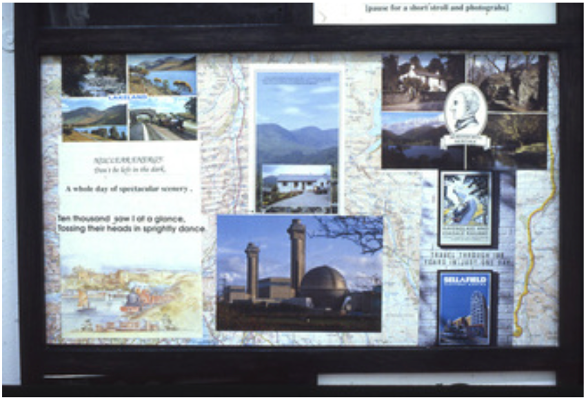 In her series, The Cost of the English Landscape, Pollard looks at the contrast between idealised tourism narrative, and the reality of industry in the Lake District.  In Fig. 3, we see an image the Pollard created by using one of typical maps that one might find on popular tourist walking routes and that usually highlight local points of interest or viewpoints.  Here though Pollard has mixed together some of the classical postcards one might find (one of them possibly being the inspiration for her earlier Wordsworth Heritage postcard idea) but also images of the Sellafield nuclear power station that is located in the area.  Again Polard has managed to combine different perspectives in a thought provoking way, we have the contrast of the postcards and the images of the power station, but also the fact that they are all presented in a traditional tourist information point which reinforces how these are all brought together in the same landscape.