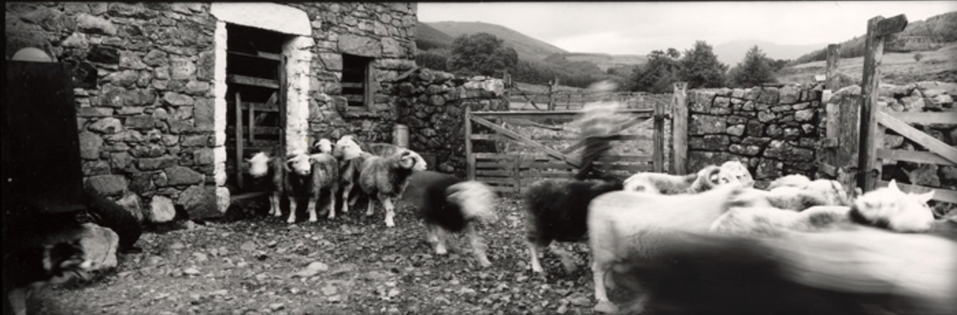 Listening to Pollard discussing landscape in a Tate gallery interview (Tate, 2009), I heard her discussing her series ‘Bursting Stone’ in which she discussed her view of the landscape and how the landscape is often defined by its boundaries, either within the landscape itself or at the boundary of the towns and countryside.  She highlighted that much of what we see as traditional English countryside is in fact a product of industry, again this is a topic that I have become very interested in as is show in my choice of subjects for my assignments.  Fig. 2 shows an example she mentioned. In the image we see classical picturesque landscape in the background, but as with her approach in Wordsworth’s Heritage, she has placed her contradiction right in front of the backdrop.  In this case we see the sheep and farmers moving, as if they are transitory in this landscape, and we see the walls of the farm blocking the view of the landscape itself, creating a separation between the beauty of the landscape and the viewer.  The image is cropped in a panoramic format, again this would typically be used in a landscape scene rather than a scene of a sheep farmer and further serves to highlight that if the farm were not there, the viewer would be looking at a panoramic, picturesque, landscape.
